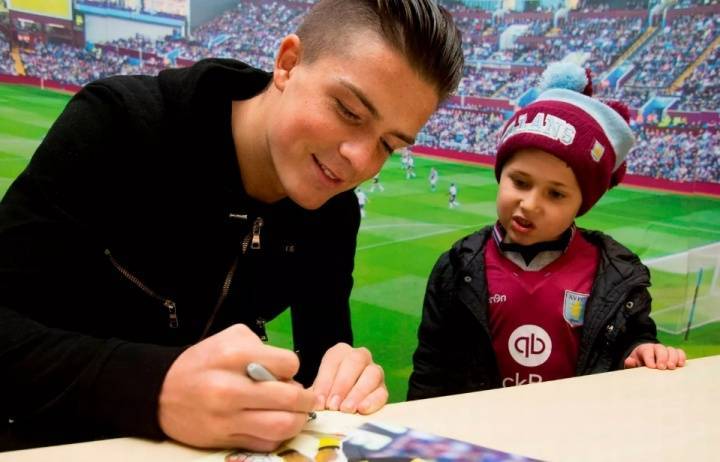 回溯格拉利什在维拉时为球迷签字的照片,格拉利什并没有这样握笔,他的握笔姿势和常人一样。